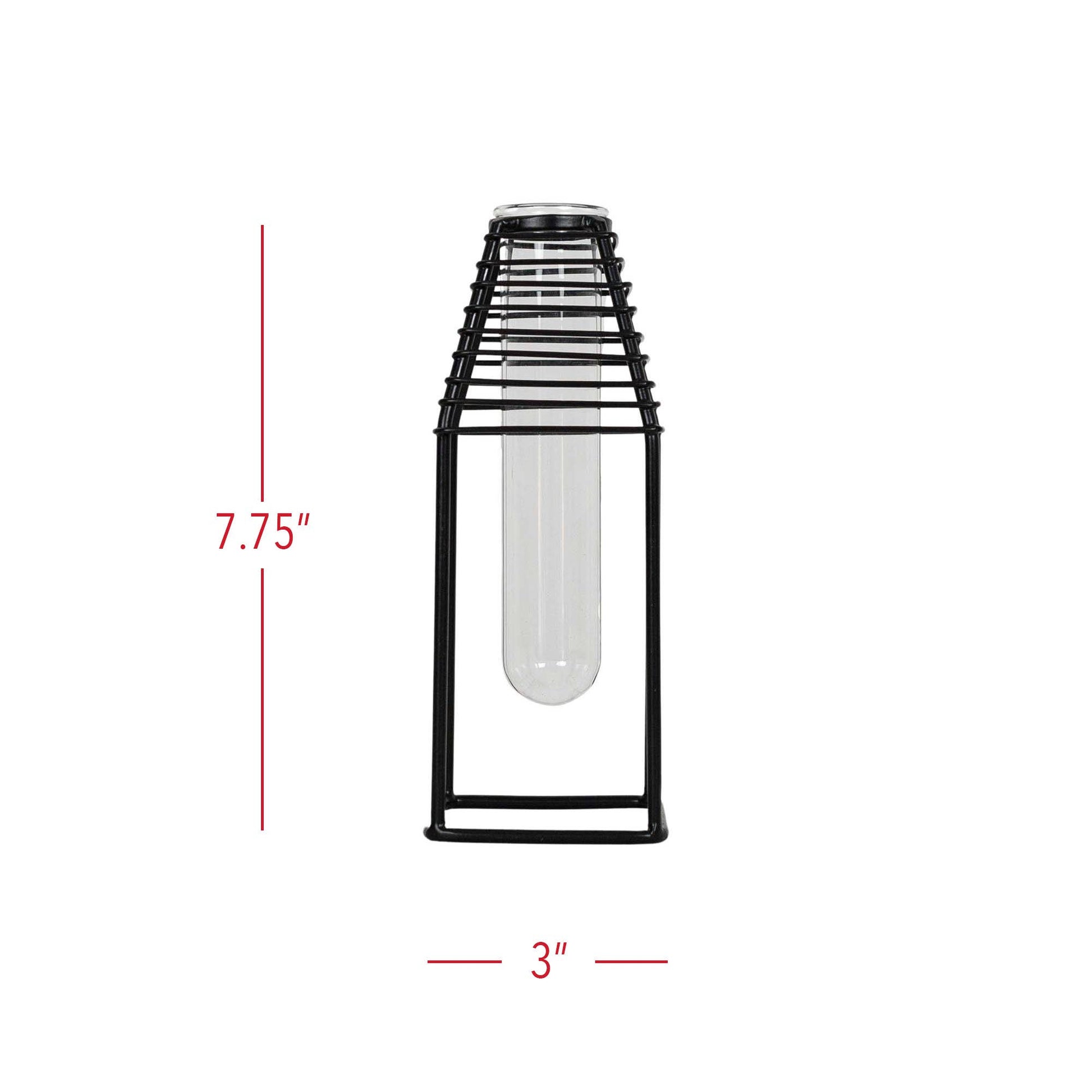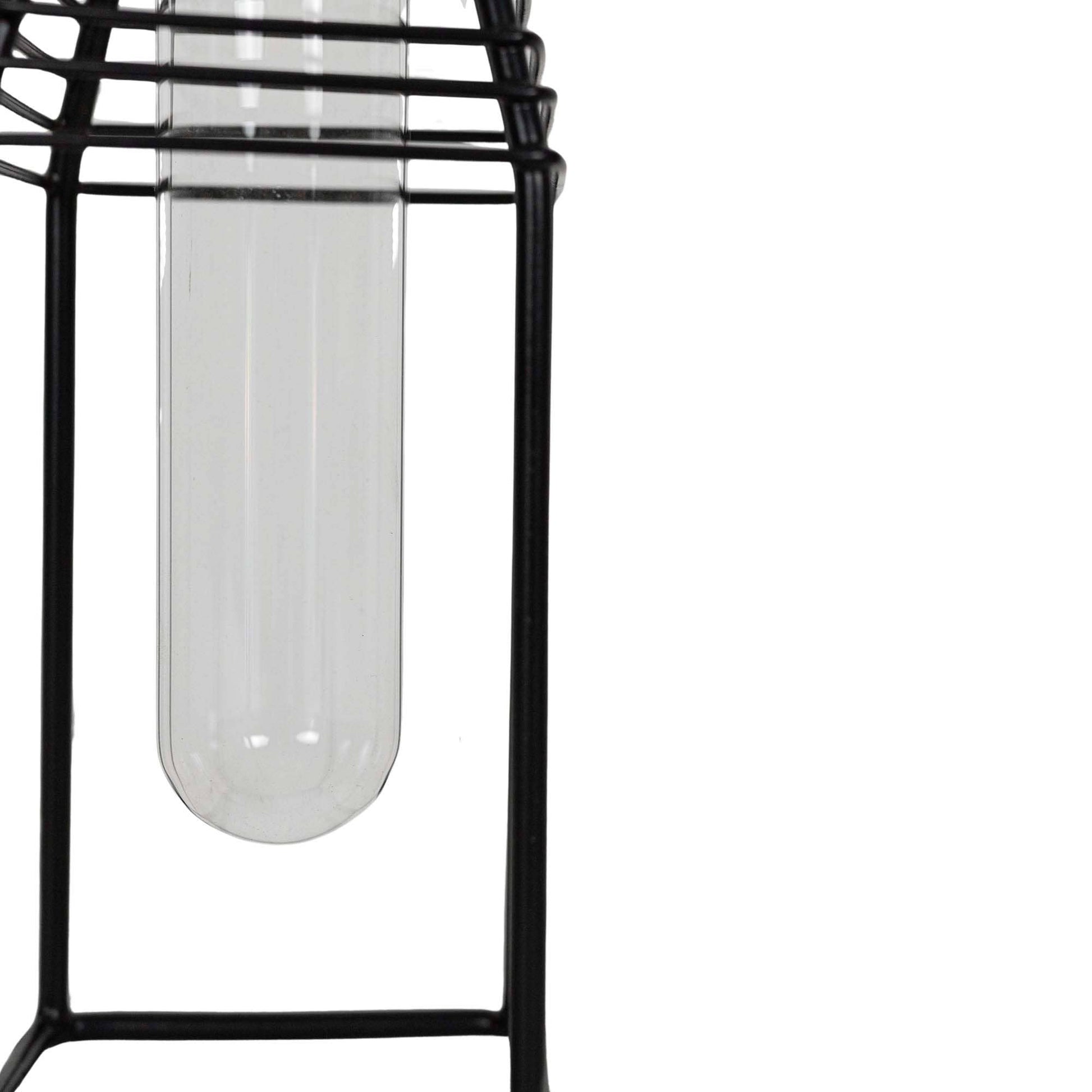 Clean and modern, this floating test tube bud vase is the perfect minimalist accent for your modern farmhouse decor. Crafted by hand, the intricate wire design is finished with a sleek black coating. The clear glass vase is suspended in the wire structure for a unique and whimsical look. Perfect for displaying a single flower or a few sprigs of greenery for a pop of color.