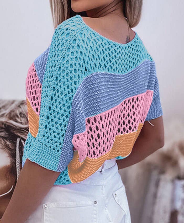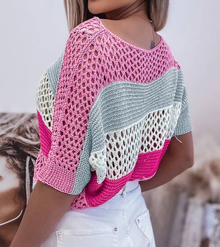 Details: Colorful stripe, colorblock design Hollowed-out, crochet knit Boat neckline. Short dolman sleeves Relaxed fit 100% Viscose.