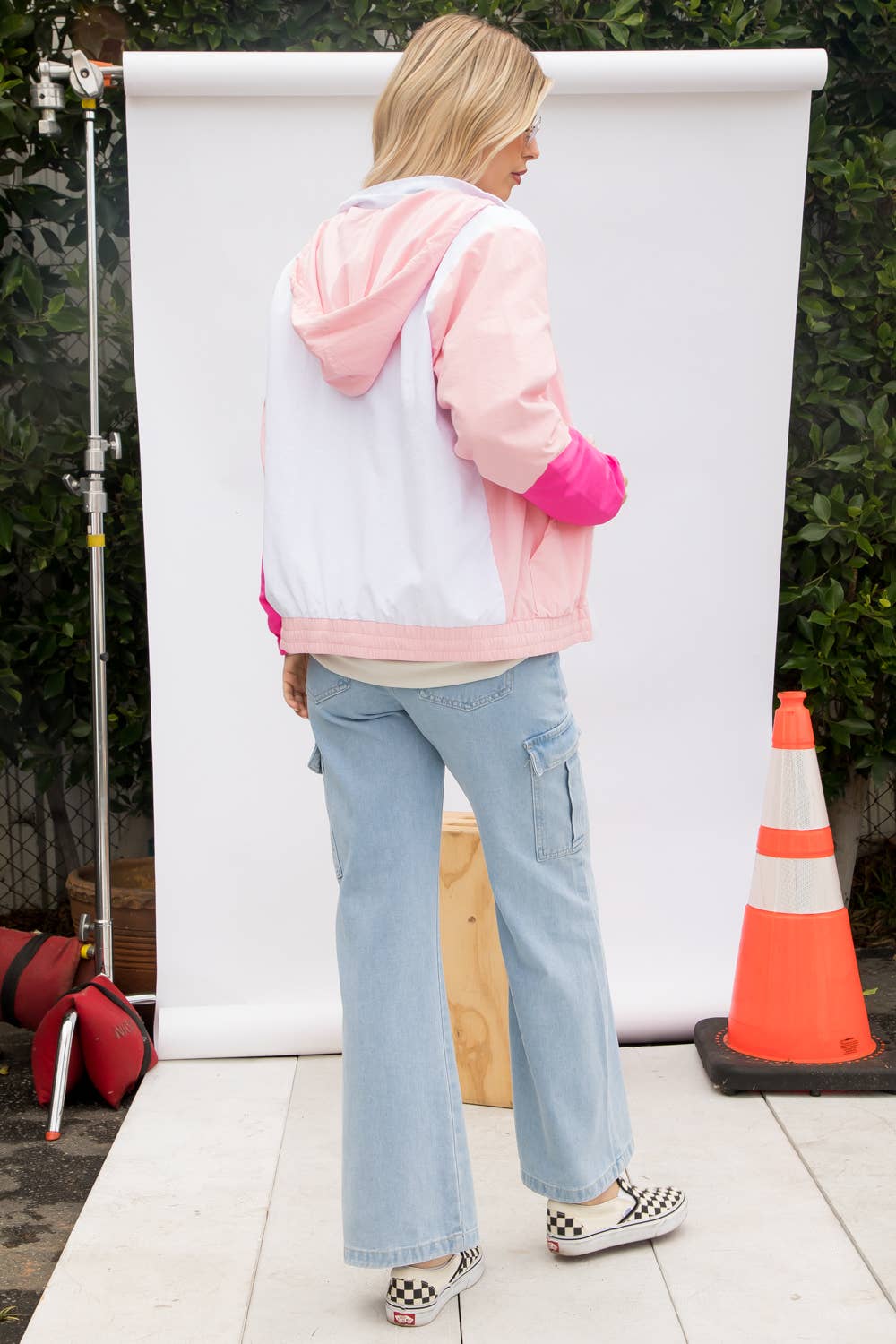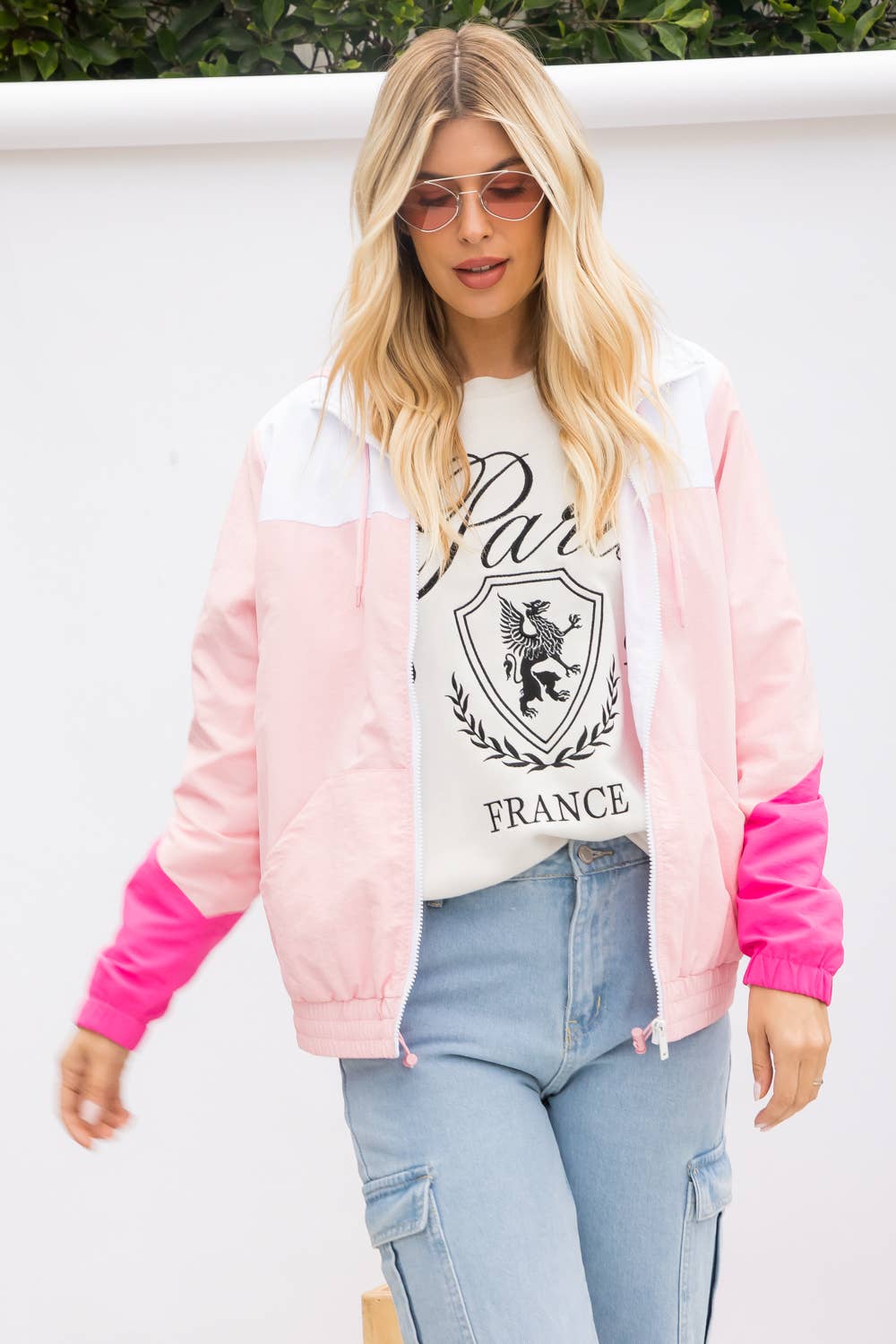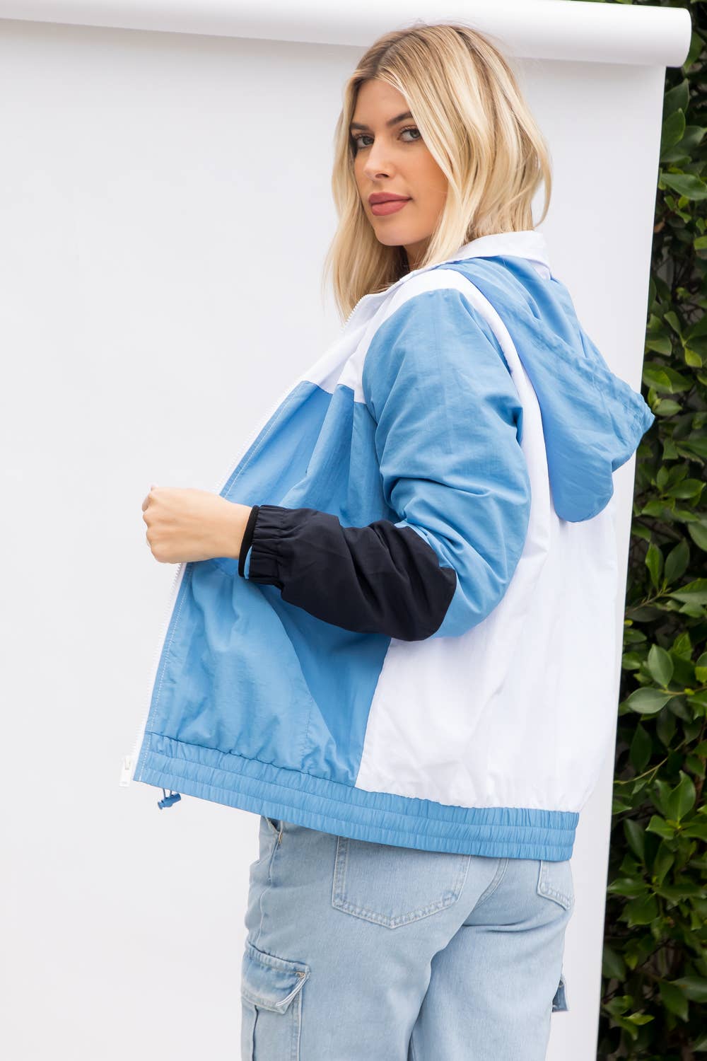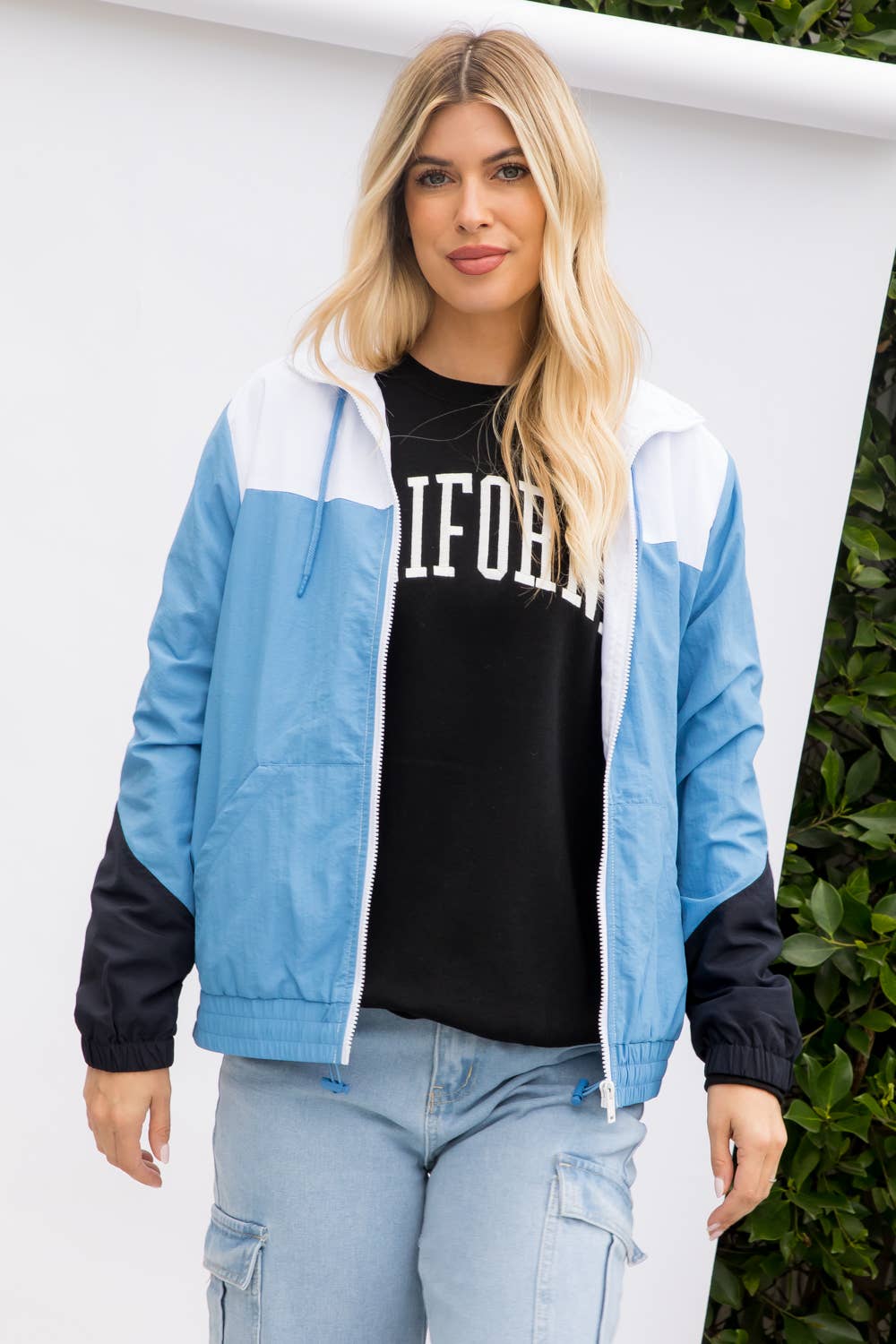 Regular Size Hooded Jacket Long Sleeve Dry Nylon Fabric Color Block Kangaroo Pocket Elastic Band at Cuff & Waist.