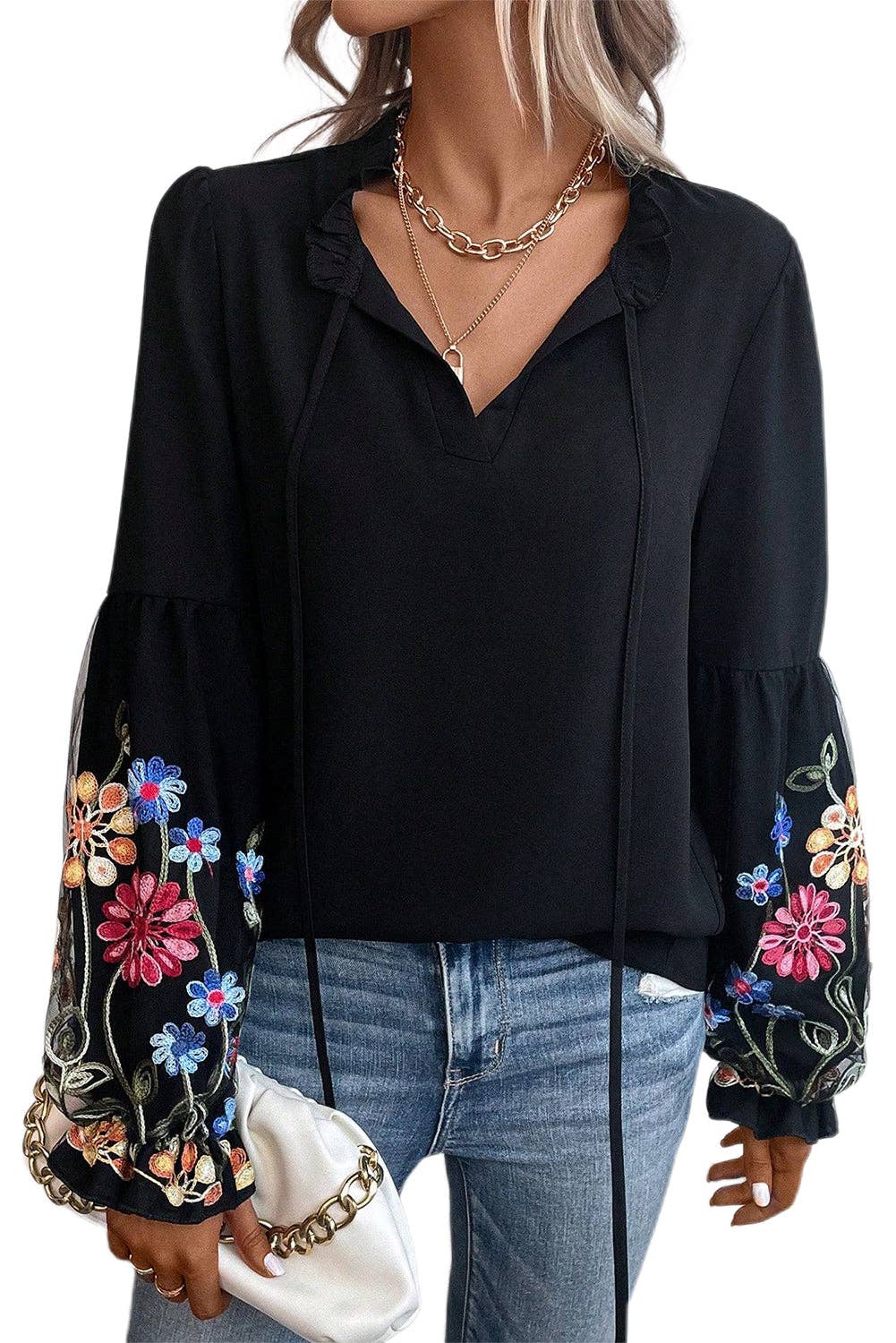 Patchwork of vibrant floral prints on the sleeves adds a splash of color and a hint of femininity, while the split neck and frilled design create a flattering and stylish look. Flounce sleeves add a trendy and playful touch to this blouse, making it a versatile piece that can be dressed up with a skirt or dressed down with jeans.