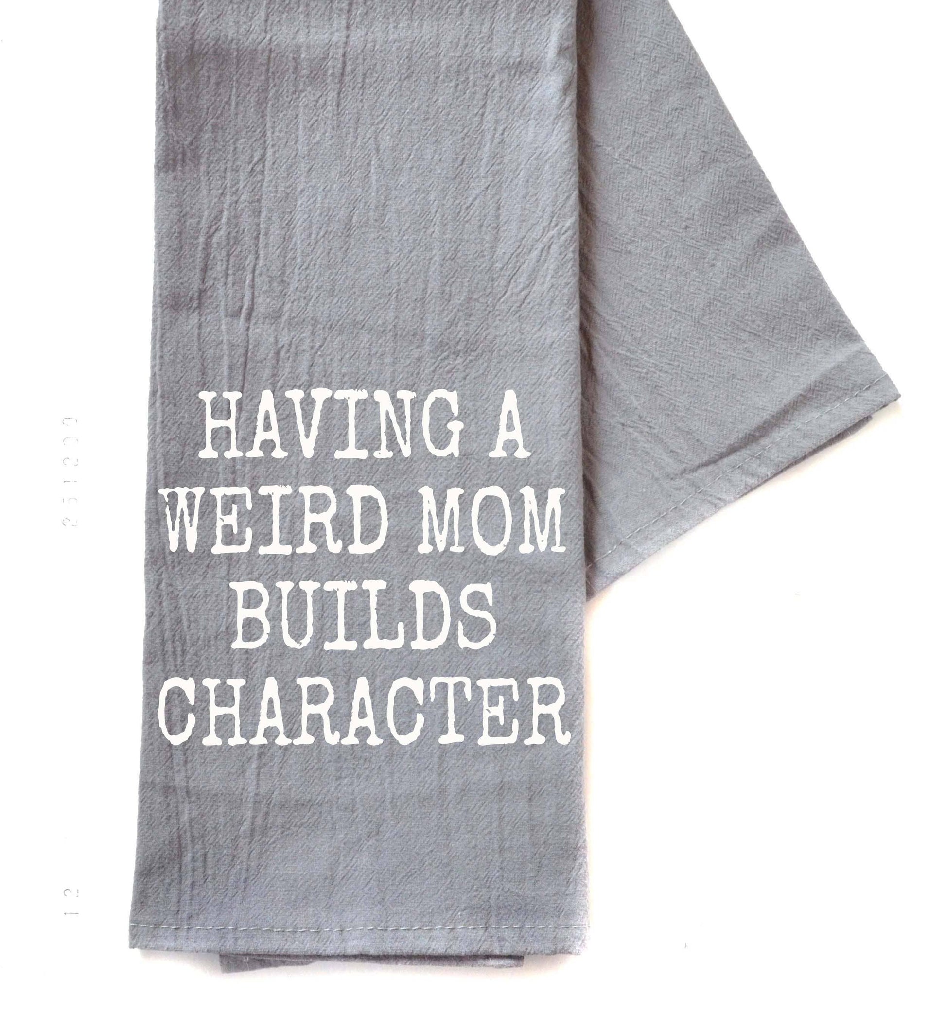 Having A Weird Mom Builds Character - Gray Tea Towel