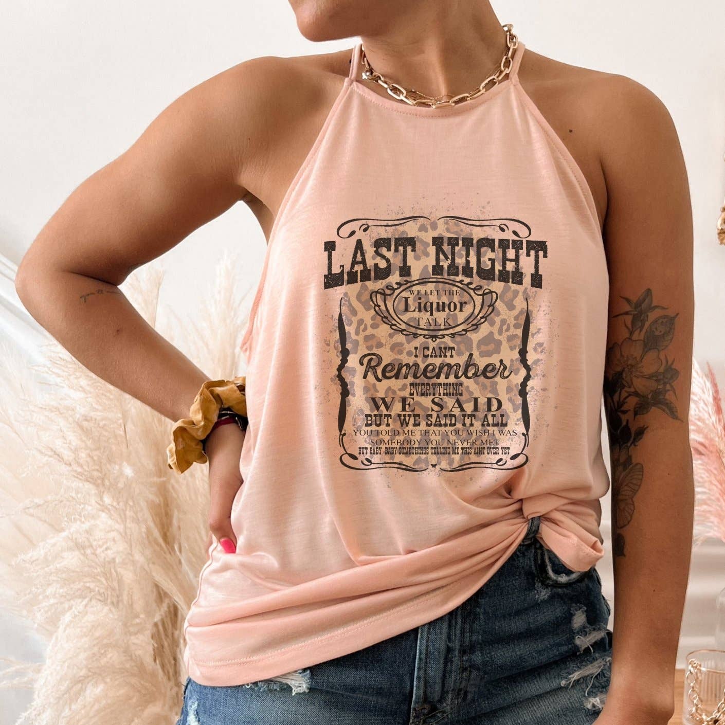 Our Last Night we let the Liquor Talk Tank Tops are the perfect country tanks for all of you Wallen fans out there! Perfect to wear any day of the week to show off your love of country music or to keep cool at your favorite music festival! Our tank tops are printed on super soft 65/35 Polyester/Viscose flowy high neck Bella Canvas Tank Tops.