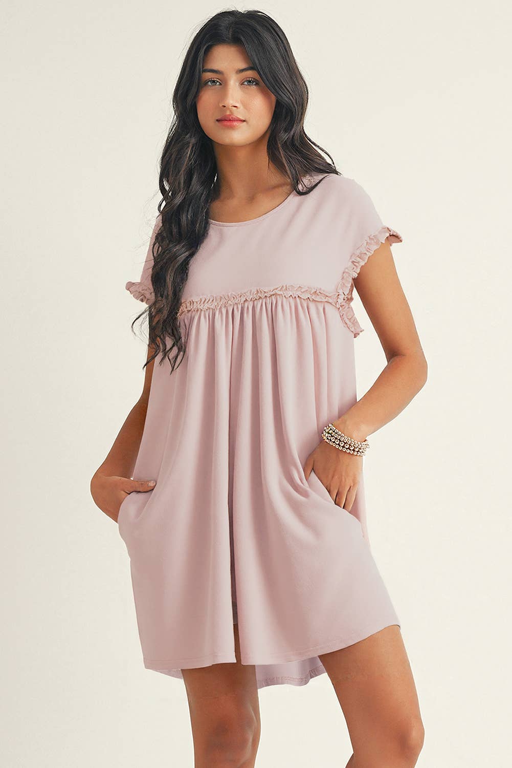 Frilled Trim Crew Neck Loose Fit Mini Dress