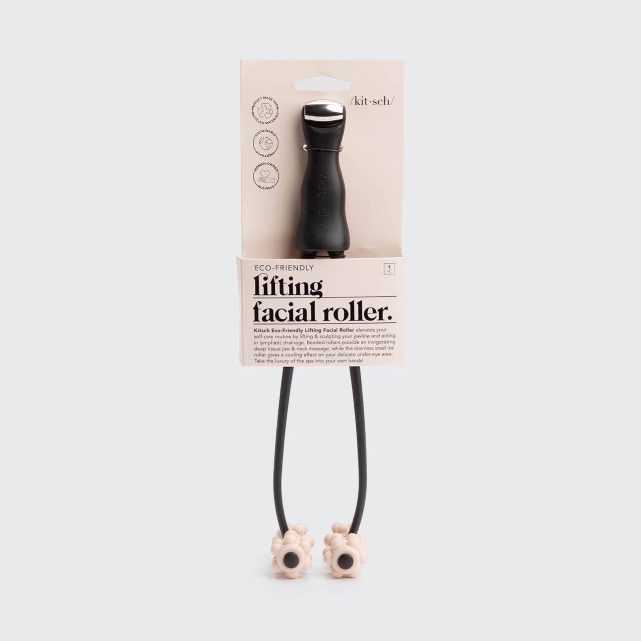 Kitsch Eco-Friendly Lifting Facial Roller elevates your self-care routine by lifting & sculpting your jawline and aiding in lymphatic drainage. Beaded rollers provide an invigorating deep tissue jaw & neck massage, while the stainless steel ice roller gives a cooling effect on your delicate under-eye area. Take the luxury of the spa into your own hands!