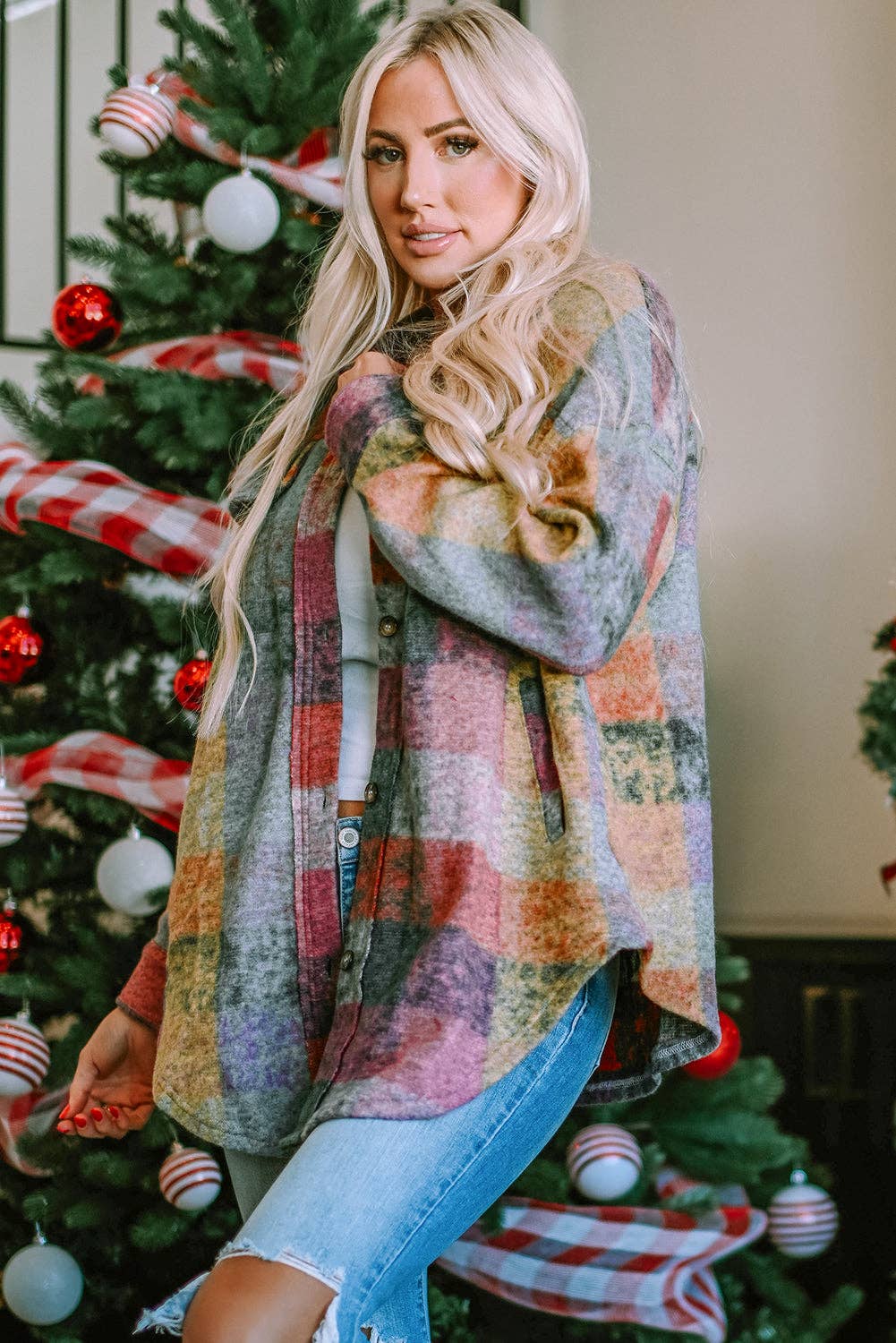 * This blushed shacket features a beautifully dyed plaid * Classic shirt-style jacket with a collar, two flap pockets, and buttons * Made of quality fabric with certain stretch to ensure an utmost comfortableness * You can layer over your ensemble whether you're indoors or out.