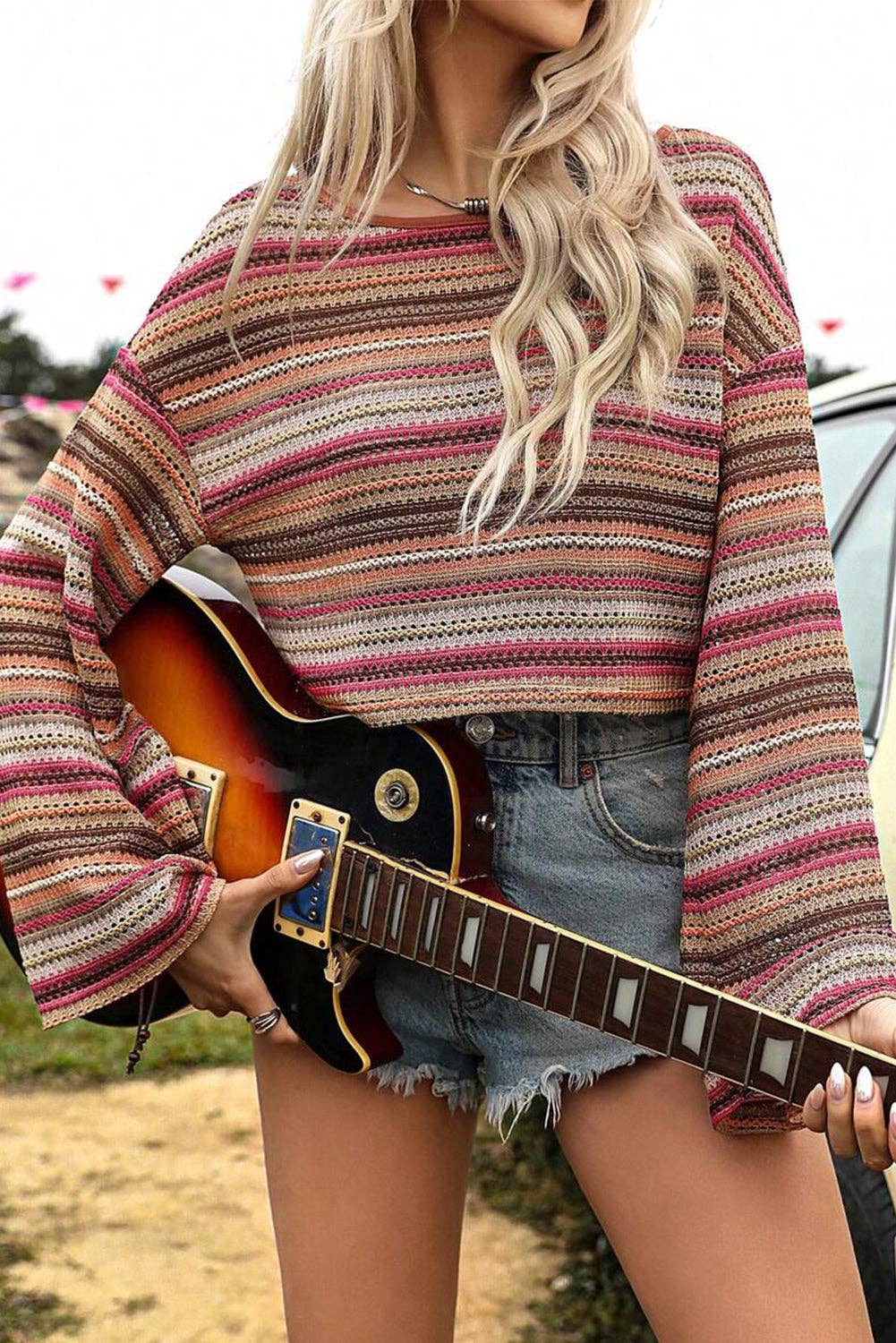Rose Red Ethnic Striped Wide Cropped Long Sleeve Top