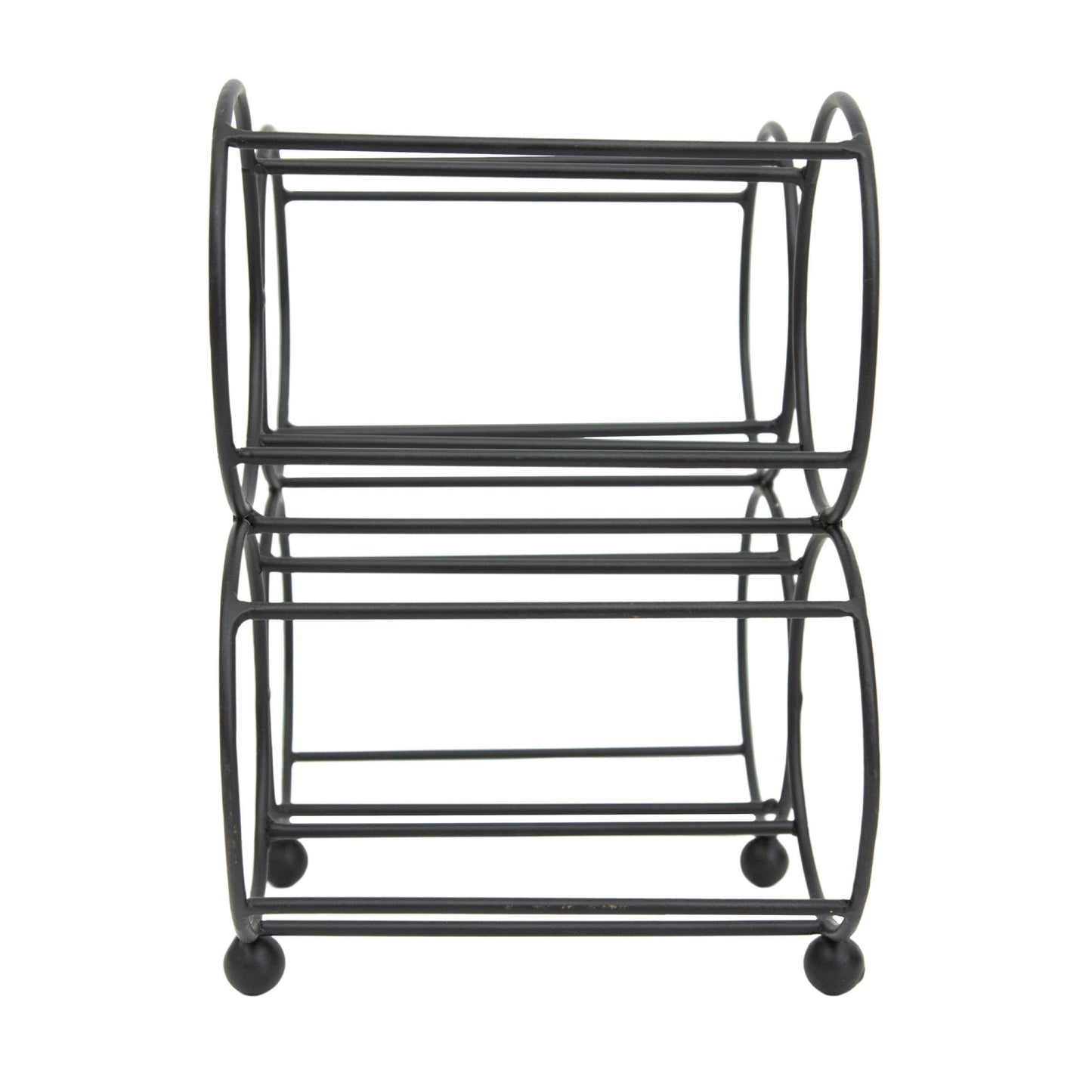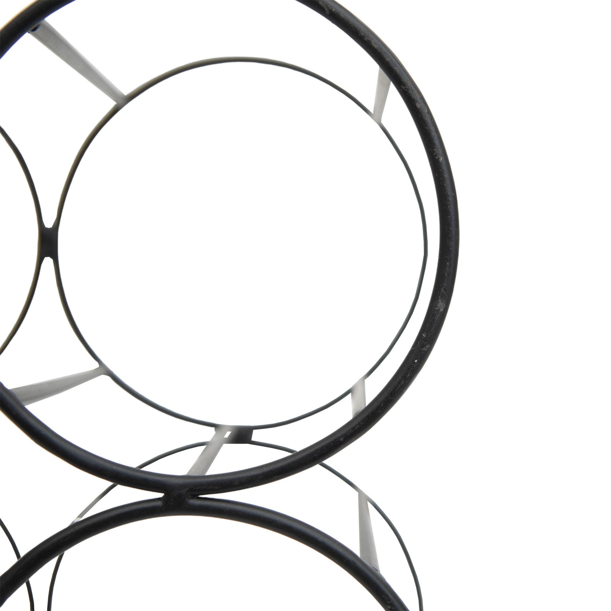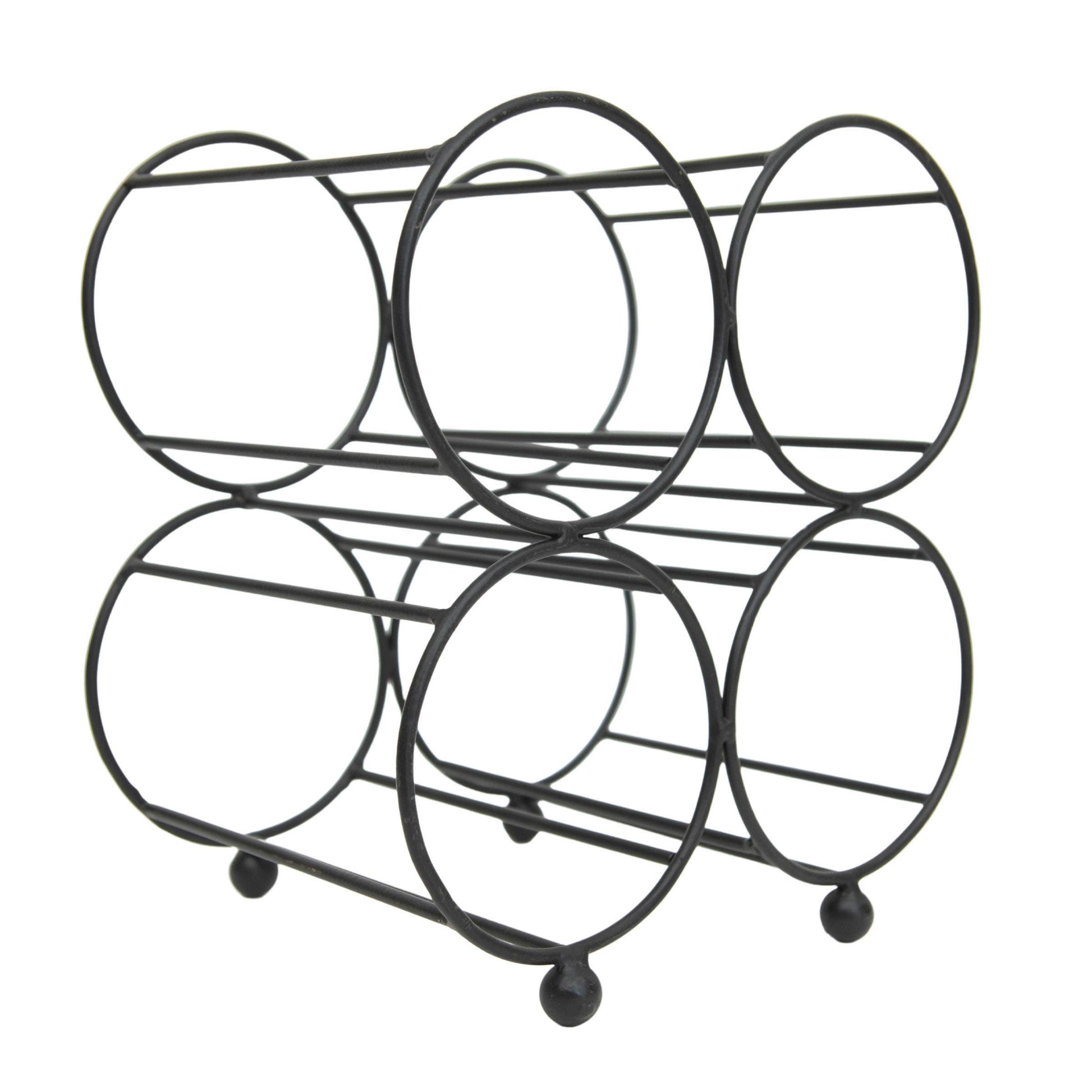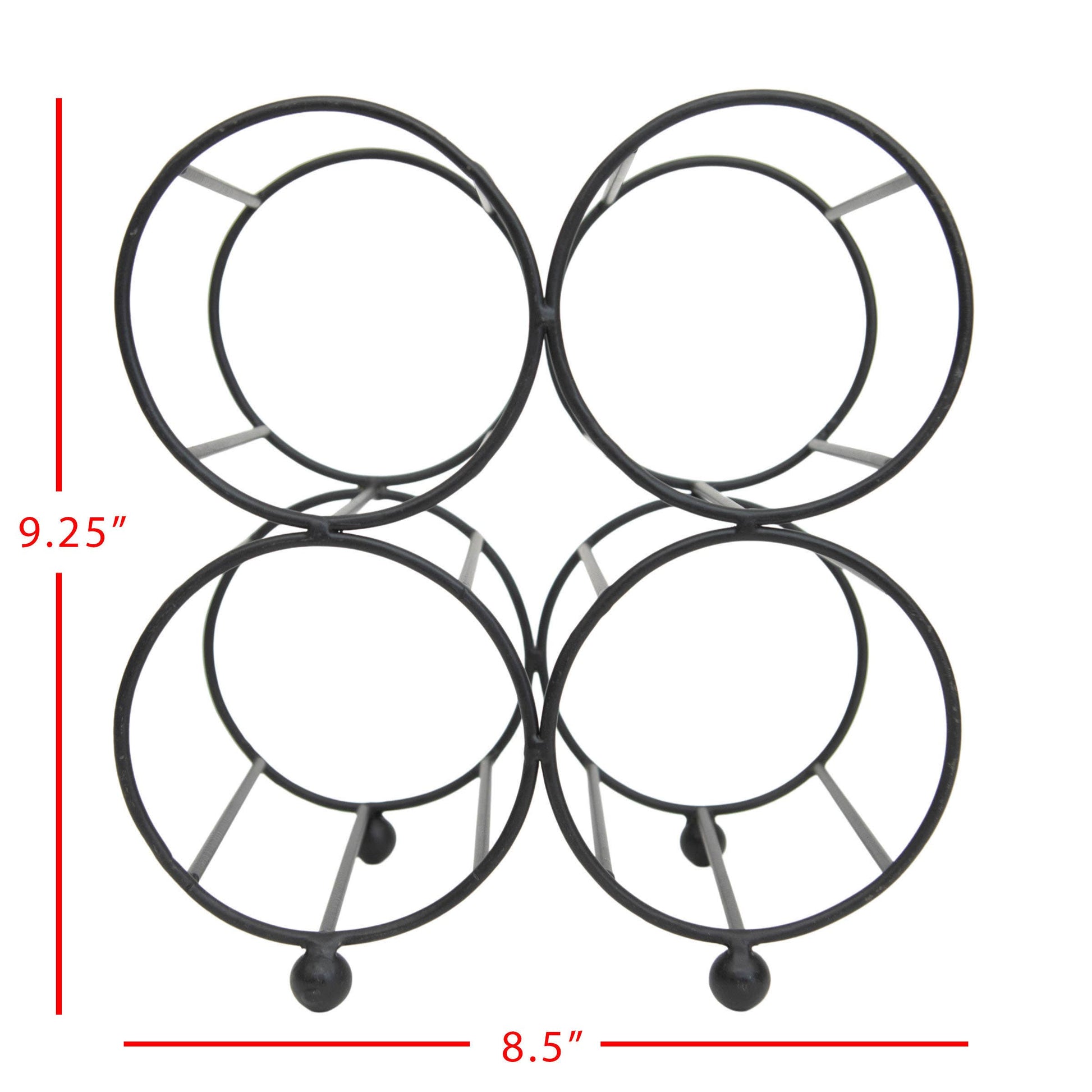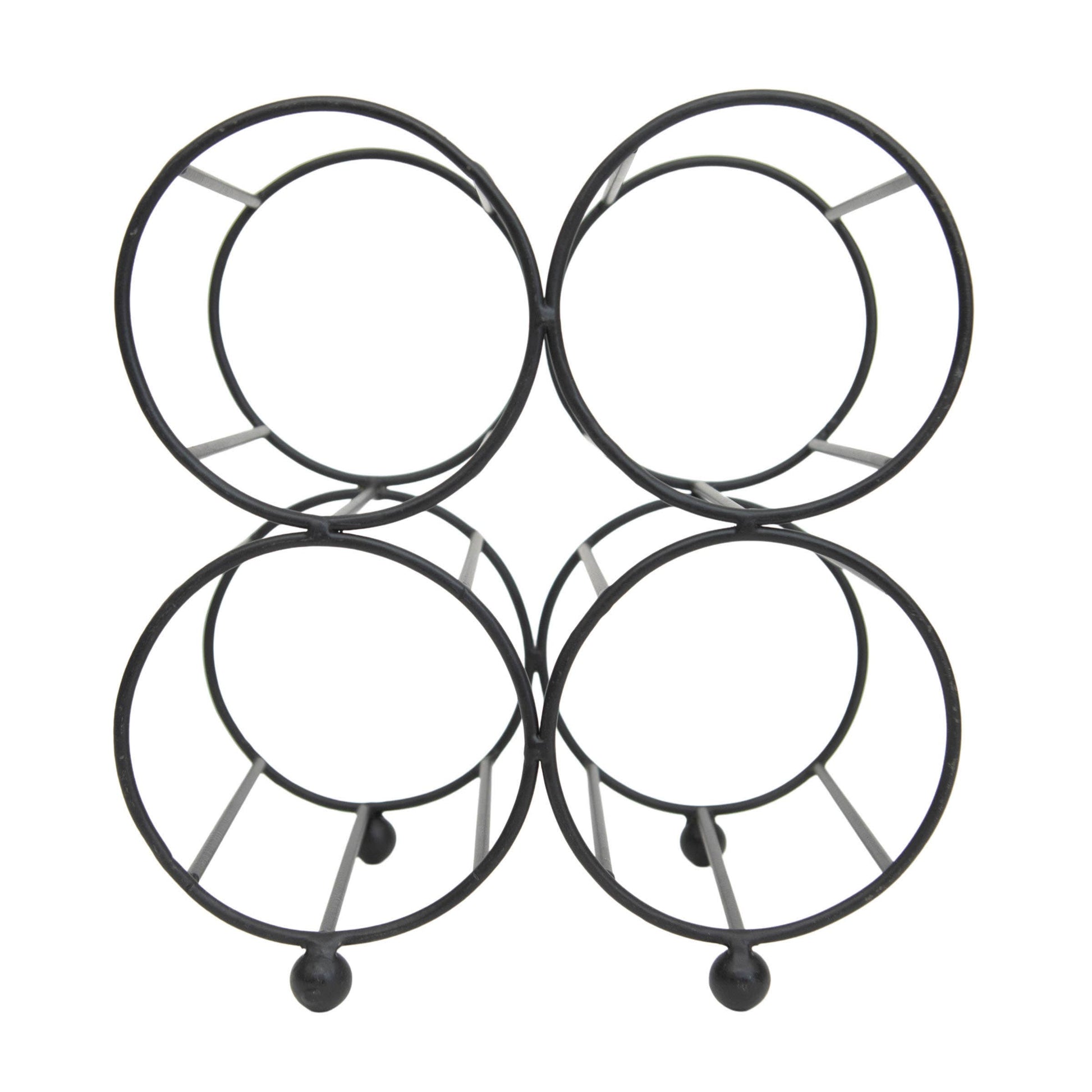 Simple and refined, bold yet airy. Foreside Home & Garden offers a modern farmhouse aesthetic for storing four of your favorite bottles of wine. Crafted from metal wire in a matte black finish, elevated by four subtle ball feet, you will want to give this piece a permanent spot on your countertop. -Wine storage; perfect size for countertop or bar. -Dimensions: 8.5 x 6 x 9.25"H; Opening diameter (4x): 3.75" Each -Materials: Metal -Black matte metal finish.