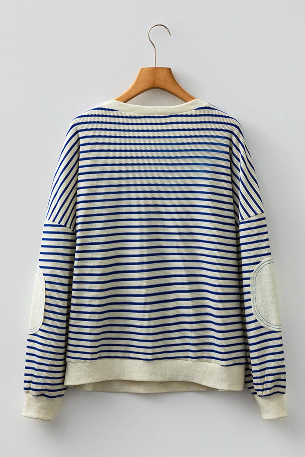 đMaterial: 95%Polyester+5%Elastane đWhy Youâll Love It? 1. Textured stripe design with elbow patches adds a stylish, casual detail. 2. Relaxed drop shoulder silhouette ensures a comfortable, laid-back fit. 3. Classic crew neck and soft fabric provide warmth and everyday comfort. 4. Perfect for layering or pairing with jeans and leggings for versatile styling.Â
