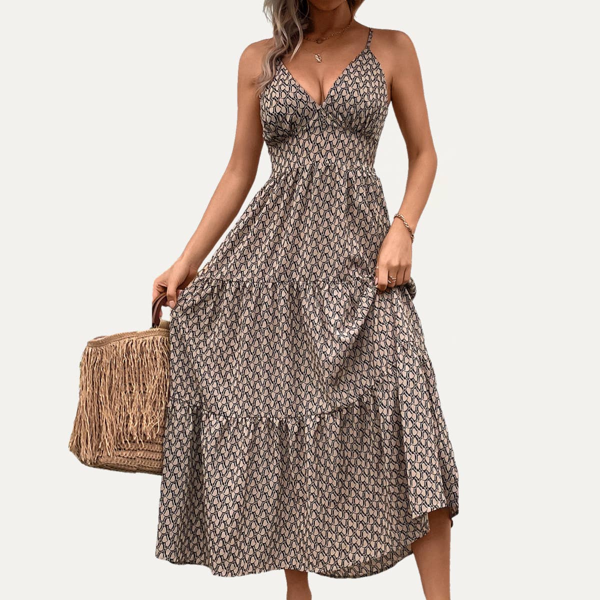 *FEATURES: Abstract Printed/Lightweight Woven Fabric/Adjustable Spaghetti Straps/Plunging V-Neckline/Sleeveless/High, Fitted Waist/Tie-Back Design/Open Back/Maxi Dress *UNLINED.