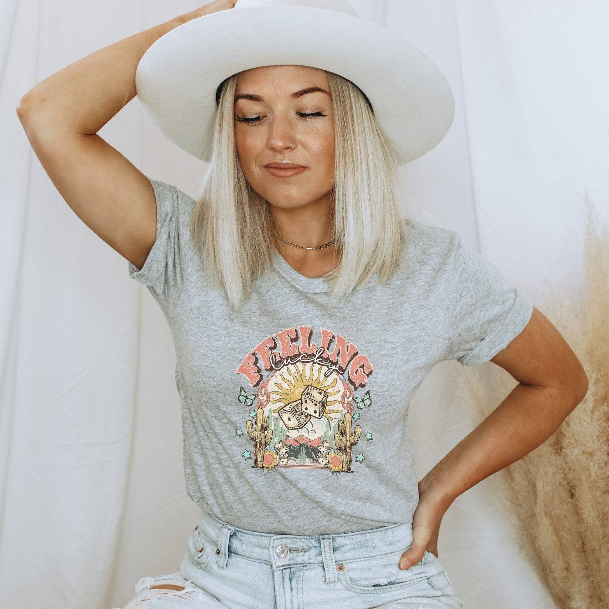 Our Western Boho Feeling Lucky T-Shirt is the perfect tee to wear all spring and summer long with shorts and boots!
